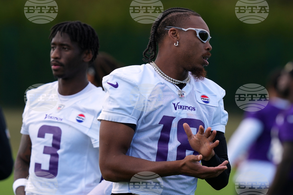 Minnesota Vikings wide receiver Jordan Addison (3) warms up during a training session ahead of their match against Pittsburgh Steelers in Dublin, Friday, Sept. 26, 2025.(AP Photo/Frank Augstein)
