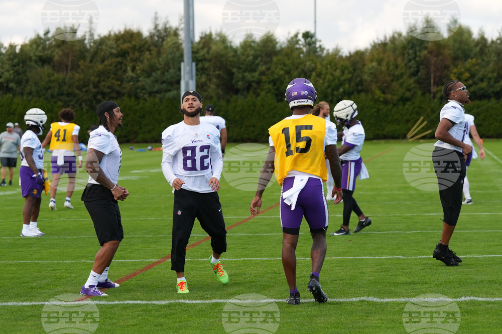 Minnesota Vikings wide receiver Jeshaun Jones (82) warms up during a training session ahead of their match against Pittsburgh Steelers in Dublin, Friday, Sept. 26, 2025.(AP Photo/Frank Augstein)