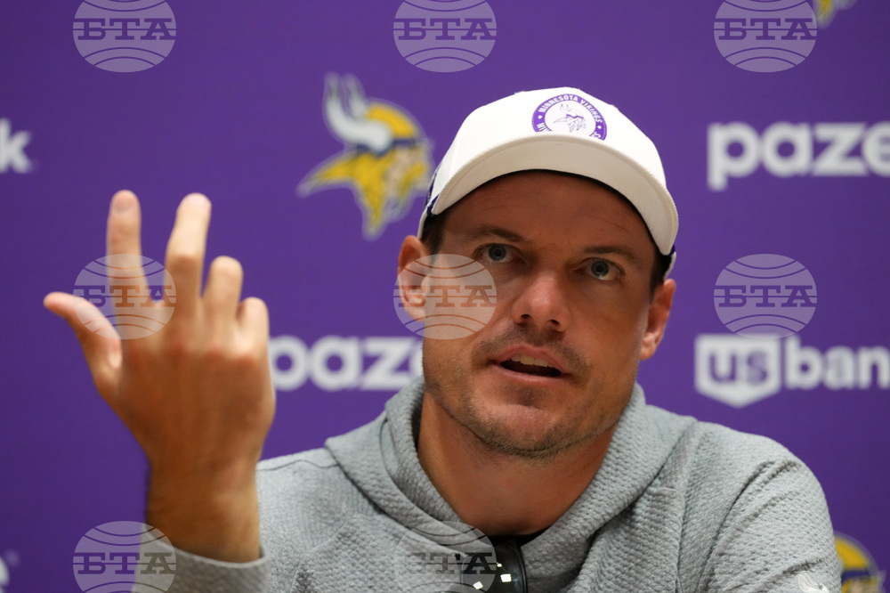Minnesota Vikings head coach Kevin O'Connell gestures during a press conference ahead of their match against Pittsburgh Steelers in Dublin, Friday, Sept. 26, 2025.(AP Photo/Frank Augstein)