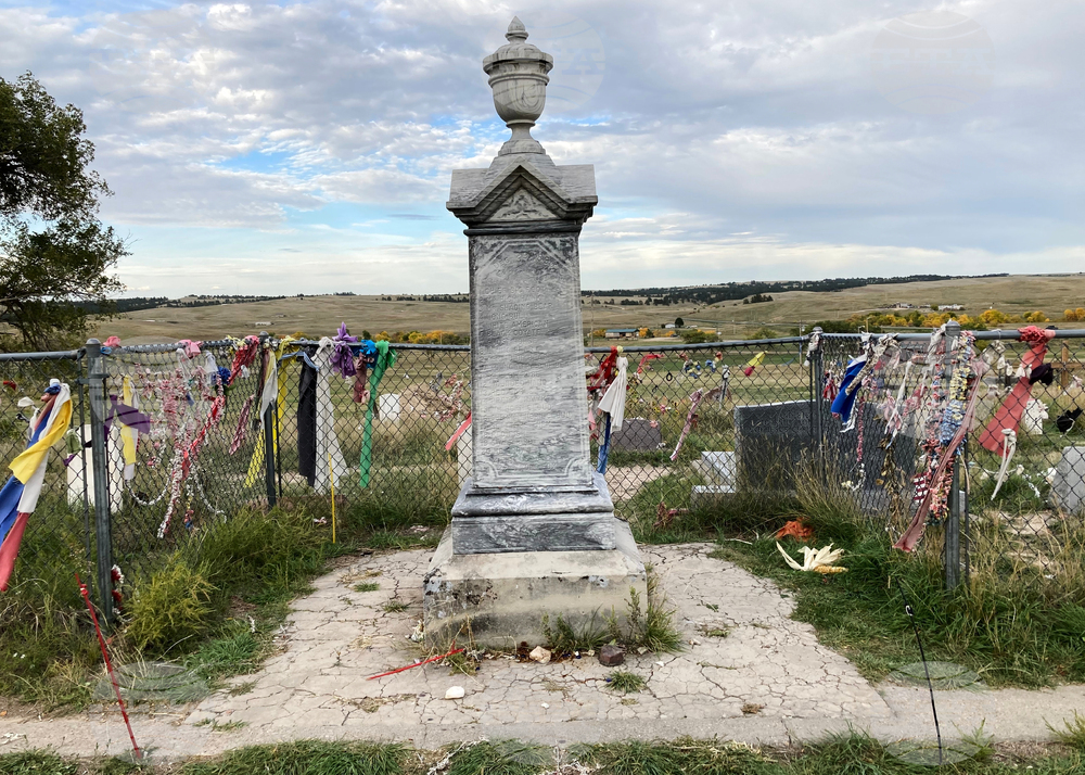 FILE - A memorial to victims of the 1890 massacre near Wounded Knee Creek on the Pine Ridge Indian Reservation is seen, S.D., Sept. 28, 2021. (AP Photo/Peter Smith, File)