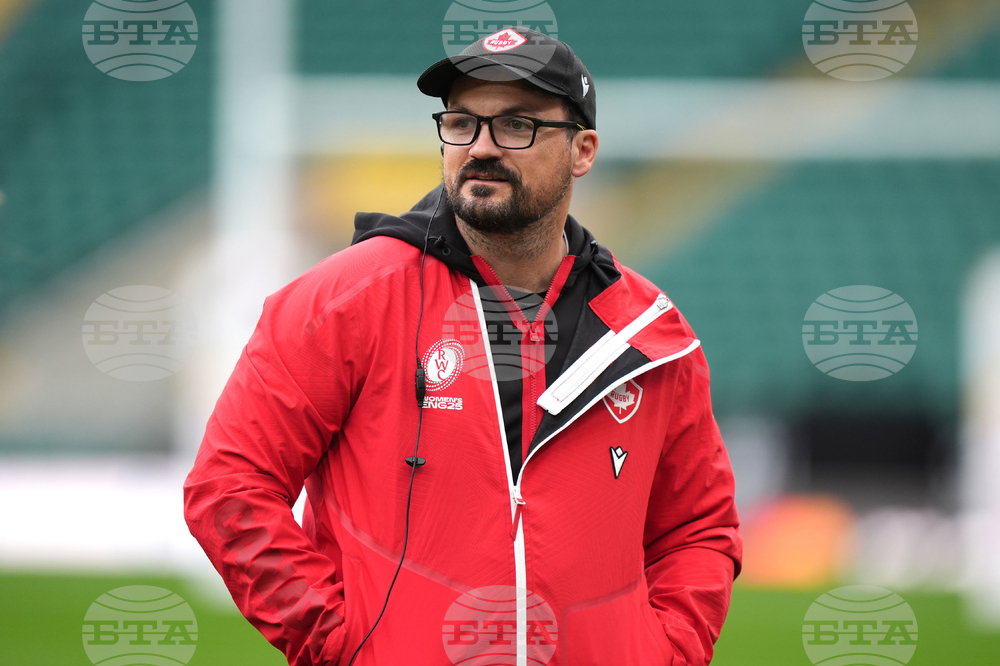 Canada head coach Kevin Rouet during the team run at the Allianz Stadium, London, Friday Sept. 26, 2025, a day ahead of facing England in the final match of the Women's Rugby World Cup. (Ben Whitley/PA via AP)