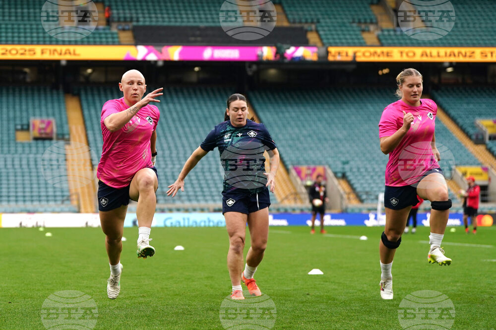 Canada's Olivia Apps, left, during the team run at the Allianz Stadium, London, Friday Sept. 26, 2025, a day ahead of facing England in the final match of the Women's Rugby World Cup. (Ben Whitley/PA via AP)