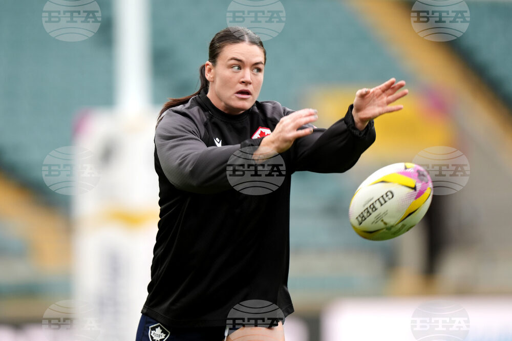 Canada's Alysha Corrigan during the team run at the Allianz Stadium, London, Friday Sept. 26, 2025, a day ahead of facing England in the final match of the Women's Rugby World Cup. (Ben Whitley/PA via AP)