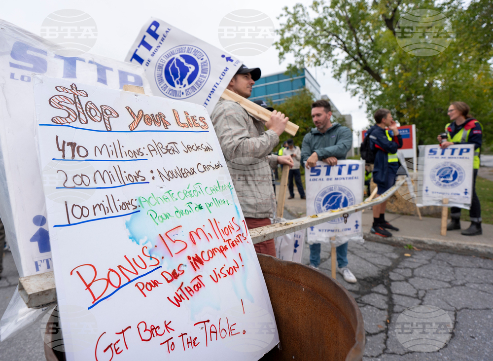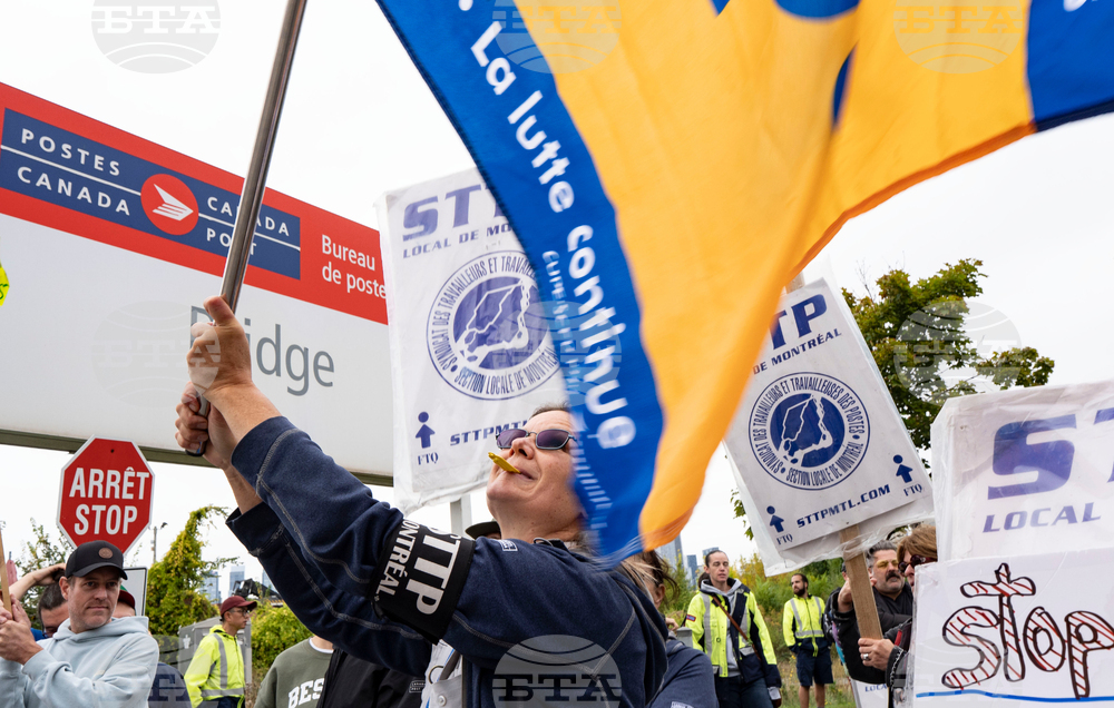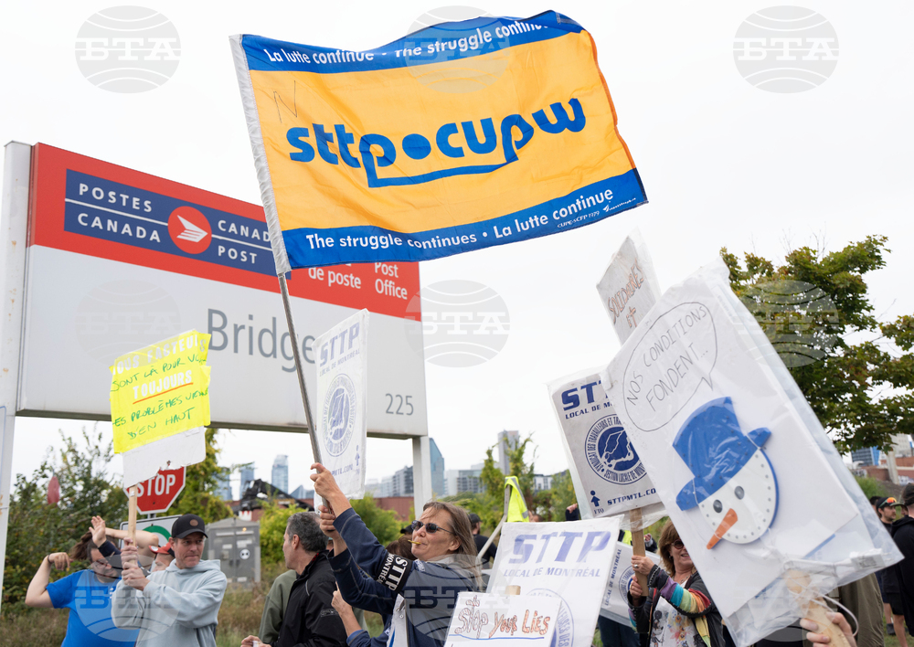 Canada Post workers picket outside a distribution centre as part of a strike action in Montreal on Friday, Sept. 26, 2025. (Christinne Muschi /The Canadian Press via AP)