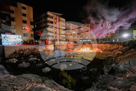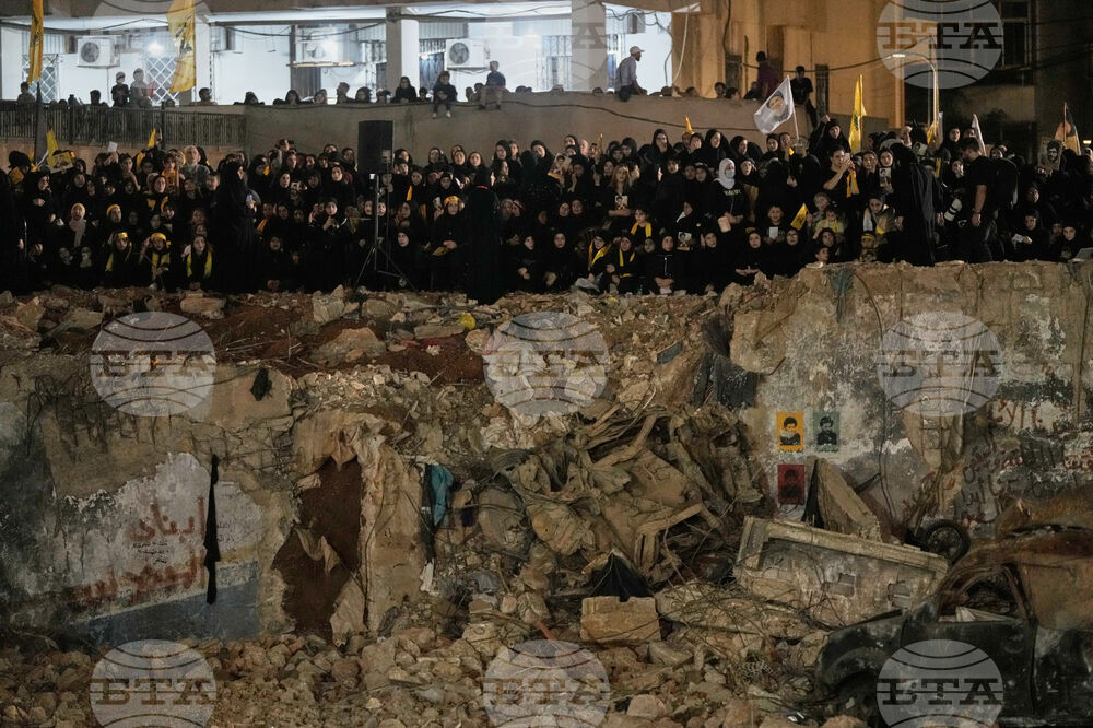 People gather at the site where Hezbollah leader Hassan Nasrallah was killed in Israeli airstrikes on Sept. 27, 2024, a day before the first anniversary of his death, in the Haret Hreik suburb south of Beirut, Lebanon, Friday, April 26, 2025. (AP Photo/Hassan Ammar)
