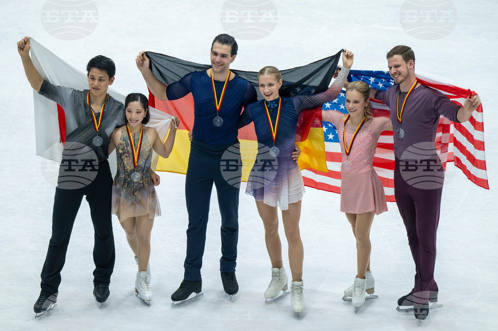 Second-placed Riku Miura and Ryuichi Kihara, left, from Japan, winners Minerva Fabienne Hase and Nikita Volodin from Germany and third-placed Alisa Efimova and Misha Mitrofanov from the United States, stand together on the ice with their national flags after the award ceremony for the pairs program at the Nebelhorn Trophy figure skating competition, Friday, Sept. 26, 2025, in Oberstdorf, Germany. (Peter Kneffel/dpa via AP)
