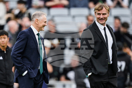 Rival coaches Australia's Joe Schmidt, left, and New Zealand's Scott Robertson chat ahead of the Bledisloe Rugby test between the All Blacks and the Wallabies at Eden Park in Auckland, New Zealand, Saturday, Sept. 27, 2025. (Andrew Cornaga/Photosport via AP)