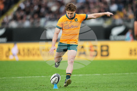 Australia's James O'Connor kicks a penalty goal during the Bledisloe Rugby test between the All Blacks and the Wallabies at Eden Park in Auckland, New Zealand, Saturday, Sept. 27, 2025. (Marty Melville/Photosport via AP)
