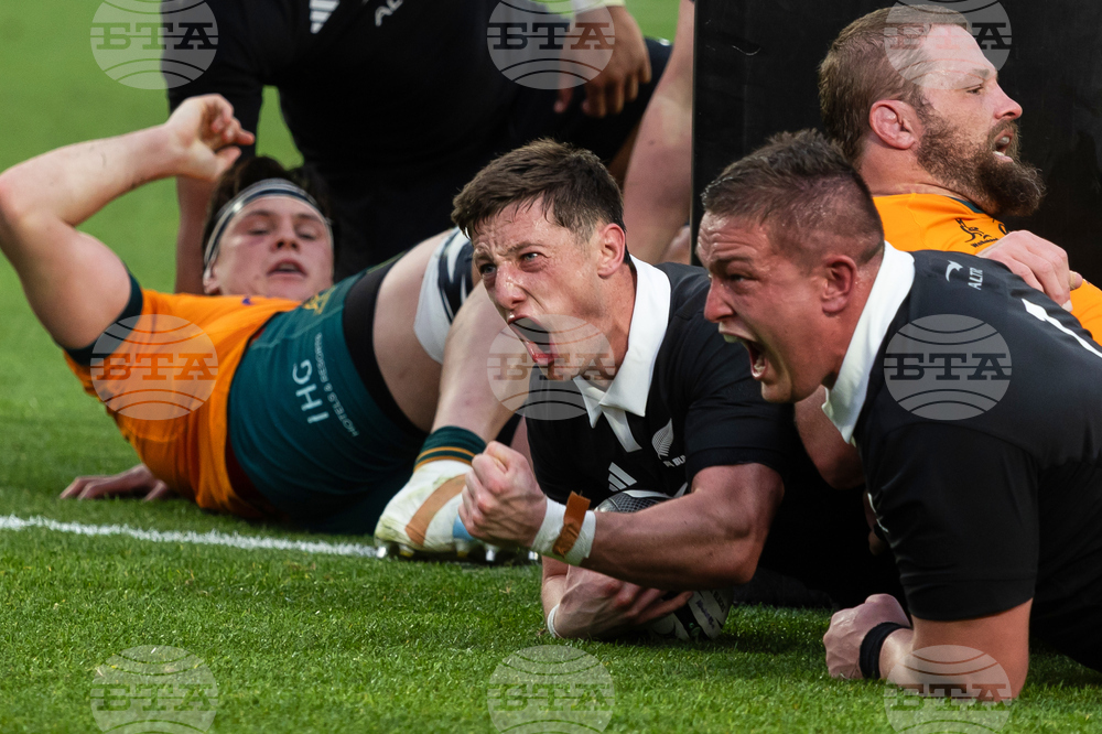 New Zealand's Caleb Clarke is tackled by Australia's Harry Potter as he scores his tea,'s first try during the Bledisloe Rugby test between the All Blacks and the Wallabies at Eden Park in Auckland, New Zealand, Saturday, Sept. 27, 2025. (Andrew Cornaga/Photosport via AP)