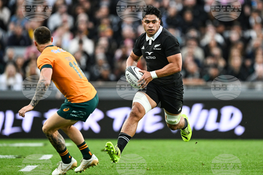 New Zealand's Caleb Clarke runs at the defence during the Bledisloe Rugby test between the All Blacks and the Wallabies at Eden Park in Auckland, New Zealand, Saturday, Sept. 27, 2025. (Andrew Cornaga/Photosport via AP)