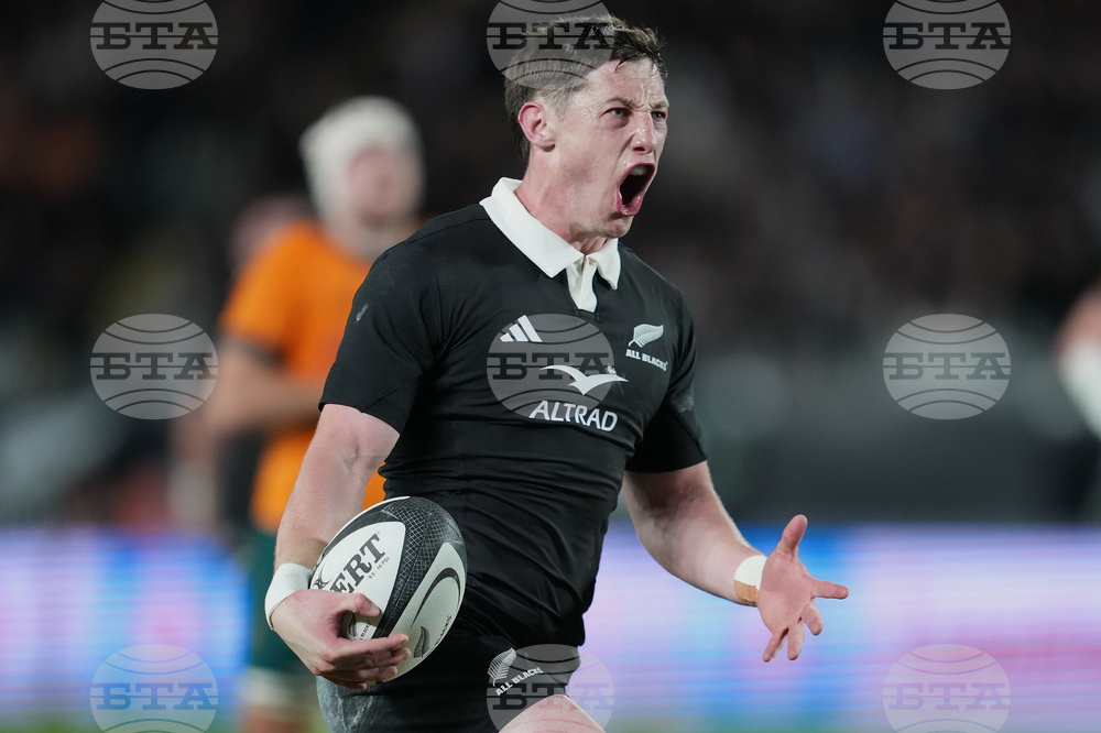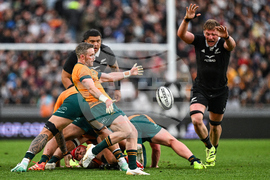 New Zealand's Leroy Carter, left, looks to pass the ball as Australia's Corey Toole attempts the tackle during the Bledisloe Rugby test between the All Blacks and the Wallabies at Eden Park in Auckland, New Zealand, Saturday, Sept. 27, 2025. (Andrew Cornaga/Photosport via AP)