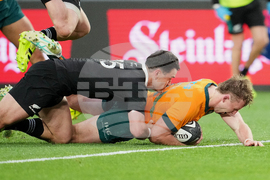Australia's Harry Potter scores a try as New Zealand's Will Jordan attempts the tackle during the Bledisloe Rugby test between the All Blacks and the Wallabies at Eden Park in Auckland, New Zealand, Saturday, Sept. 27, 2025. (Marty Melville/Photosport via AP)