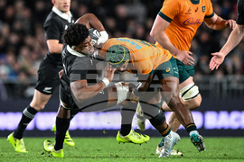 New Zealand's Peter Lakai is tackled by Australia's Filipo Daugunu during the Bledisloe Rugby test between the All Blacks and the Wallabies at Eden Park in Auckland, New Zealand, Saturday, Sept. 27, 2025. (Andrew Cornaga/Photosport via AP)