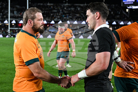 Australia's James Slipper, left, shakes hands with New Zealand's Will Jordan following the Bledisloe Rugby test between the All Blacks and the Wallabies at Eden Park in Auckland, New Zealand, Saturday, Sept. 27, 2025. (Andrew Cornaga/Photosport via AP)
