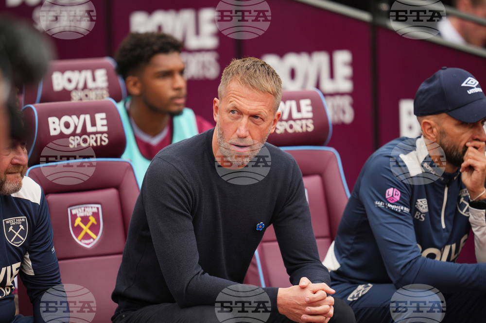 FILE - West Ham's head coach Graham Potter sits on the bench prior to the English Premier League soccer match between West Ham United and Crystal Palace at the London Stadium in London, Saturday, Sept. 20, 2025. (AP Photo/Kin Cheung, file)