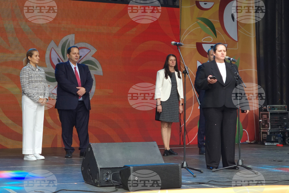 Кюстендил (27 септември 2025) В Кюстендил официално бе открит „Празник на плодородието“ 2025 г. Производители от региона, читалища и организации, се представят с художествено аранжирани маси с плодове и зеленчуци, а художници и занаятчии показват свои оригинални художествени произведения, изложени в центъра на града в дните на празника. Програмата включва представяне на сортове ябълки от Институт по земеделие - Кюстендил и музикална програма. На снимката: заместник-министърът на труда и социалната политика Гергана Алексова-Великова (вдясно).