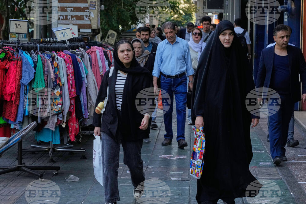 People walk on a sidewalk at the Enqelab-e-Eslami (Islamic Revolution) street, in Tehran, Iran, Saturday, Sept. 27, 2025. (AP Photo/Vahid Salemi)