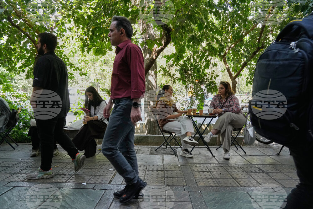 Women sit in the al fresco dining area of a cafe as pedestrians walk on the sidewalk at the Enqelab-e-Eslami (Islamic Revolution) street, in Tehran, Iran, Saturday, Sept. 27, 2025. (AP Photo/Vahid Salemi)