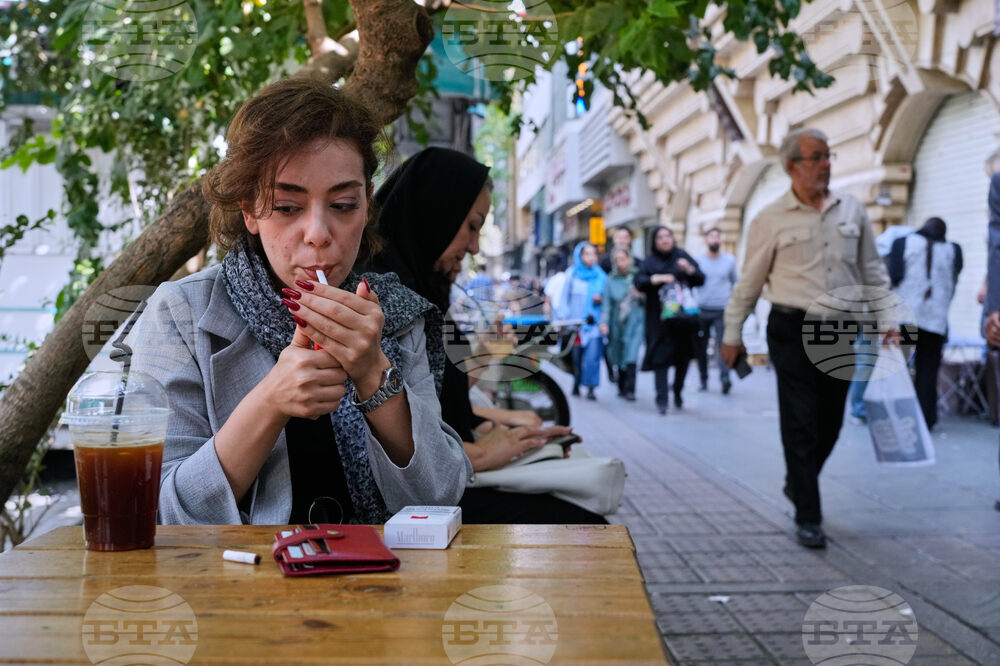 A woman lights a cigarette in the alfresco dining area of a cafe at the Enqelab-e-Eslami (Islamic Revolution) street, in Tehran, Iran, Saturday, Sept. 27, 2025. (AP Photo/Vahid Salemi)