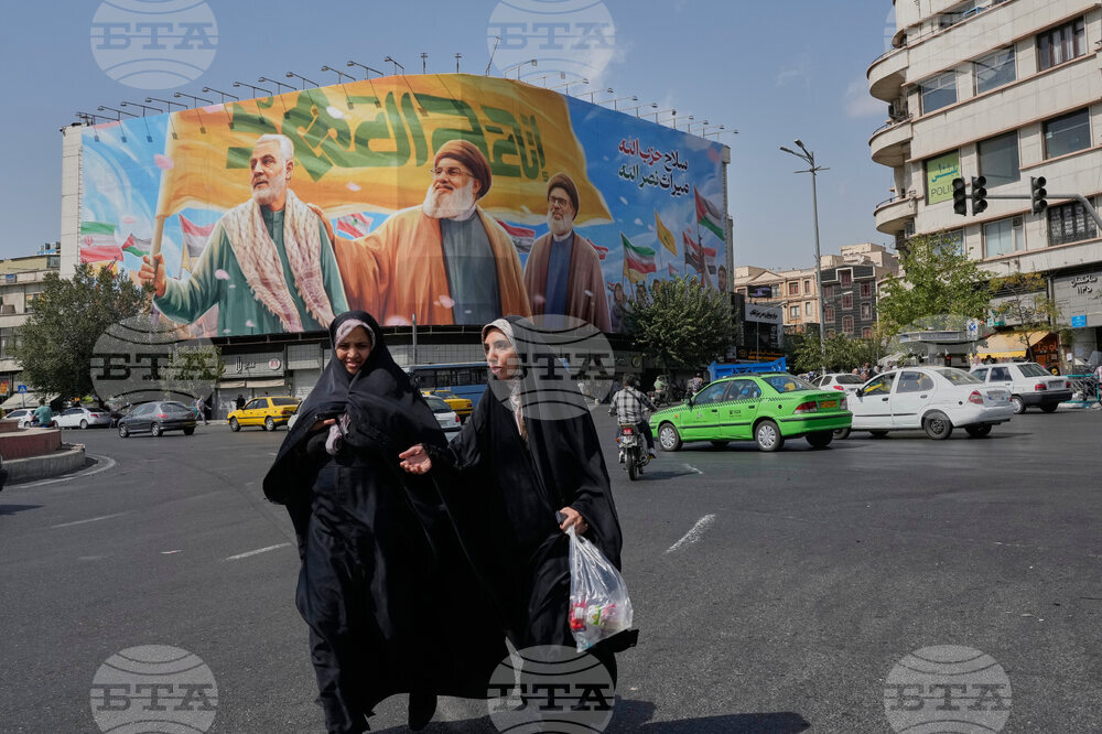 Two women walk past a huge banner showing the late commander of the Iran's Revolutionary Guard expeditionary Quds Force, Gen. Qassem Soleimani, who was killed in a U.S. drone attack in 2020, and two late Hezbollah leaders Hassan Nasrallah, center, and Hashem Safieddine, who were killed in Israeli airstrikes in 2024, at the Enqelab-e-Eslami (Islamic Revolution) square, in Tehran, Iran, Saturday, Sept. 27, 2025. (AP Photo/Vahid Salemi)