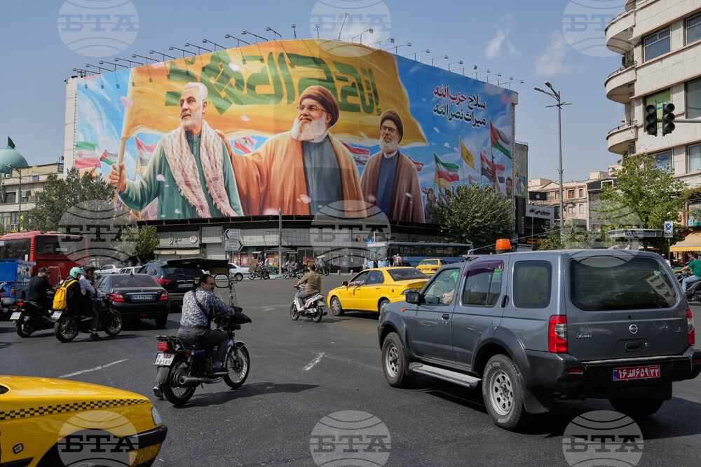 People drive past a huge banner showing the late commander of the Iran's Revolutionary Guard expeditionary Quds Force, Gen. Qassem Soleimani, who was killed in a U.S. drone attack in 2020, and two late Hezbollah leaders Hassan Nasrallah, center, and Hashem Safieddine, who were killed in Israeli airstrikes in 2024, at the Enqelab-e-Eslami (Islamic Revolution) square, in Tehran, Iran, Saturday, Sept. 27, 2025. (AP Photo/Vahid Salemi)