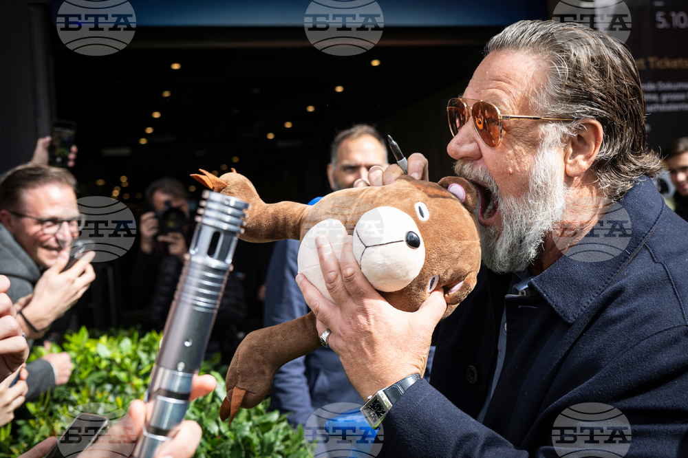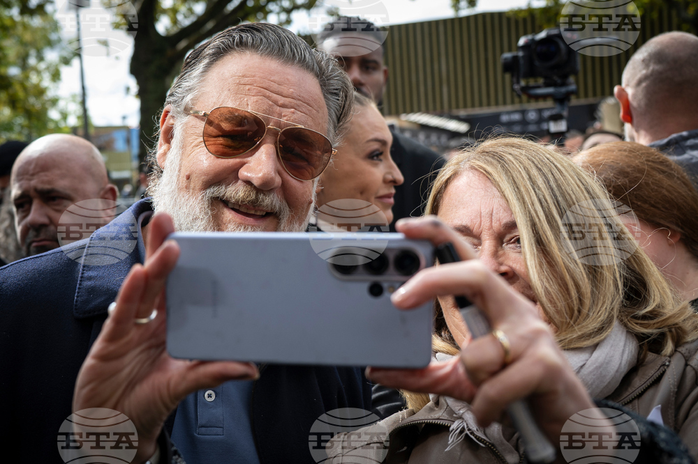 Russell Crowe takes a selfie with a fan on the Green Carpet of the 21th Zurich Film Festival (ZFF) in Zurich, Switzerland, Saturday, Sept. 27, 2025. (Andreas Becker/Keystone via AP)