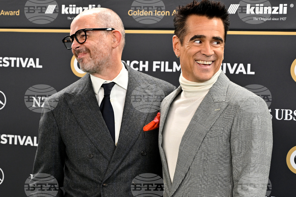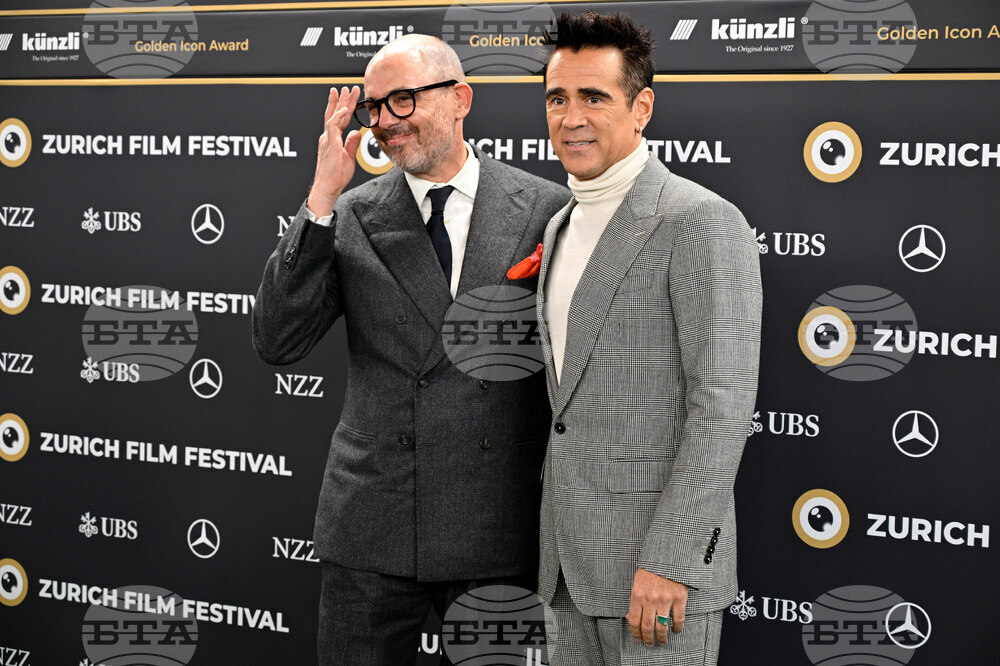 Swiss-Austrian film director Edward Berger, left, and Irish actor Colin Farrell, right, pose on the green carpet during the 21th annual Zurich Film Festival in Zurich, Switzerland, on Saturday, Sept. 27, 2025. (Walter Bieri/Keystone via AP)