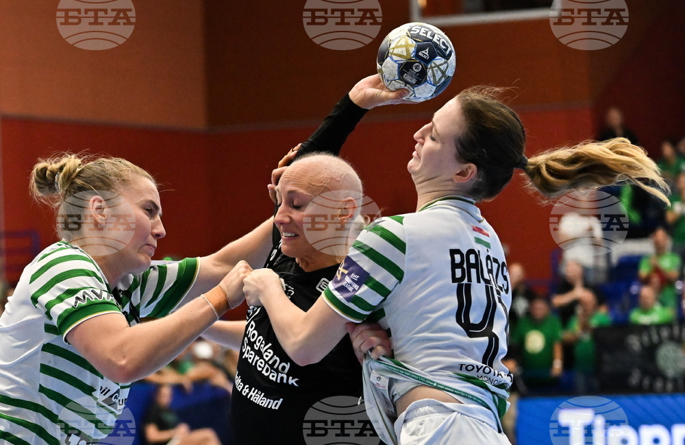 Vilde Mortensen Ingstad, left, and Bitia Balazs, right, of Ferencvaros in action against Camilla Herrem of Sola HK during the women's handball Champions' League Group A 3rd round match between FTC-Rail Cargo and Sola HK in Erd, Hungary, Saturday, Sept. 27, 2025. (Tibor Illyes/MTI via AP)