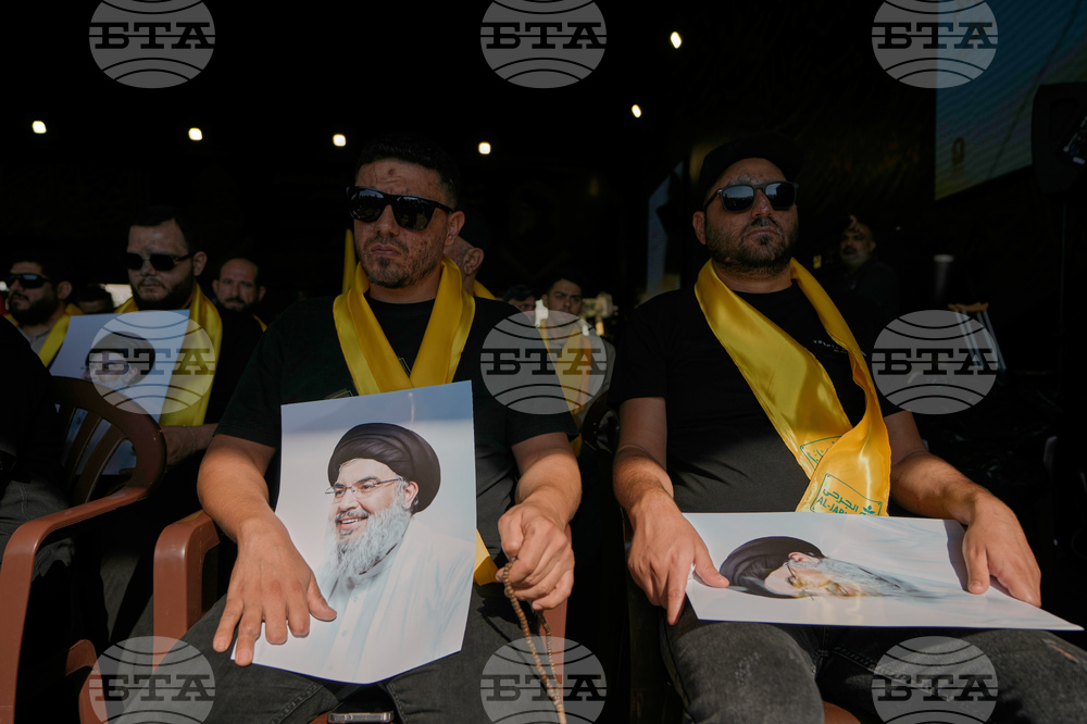 Hezbollah supporters gather to mark the first anniversary of the assassination of Hezbollah leader Sayyed Hassan Nasrallah, who was killed in Israeli airstrikes, at Nasrallah's grave in Beirut, Lebanon, Saturday, Sept. 27, 2025. (AP Photo/Bilal Hussein)