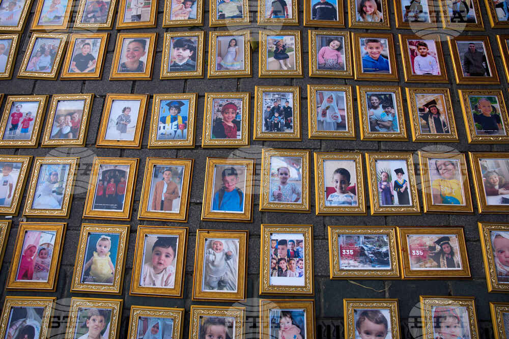 Photos of Palestinian children killed during the Israeli air and ground operations in the Gaza Strip are displayed during a pro-Palestinians protest, in Istanbul, Turkey, Saturday, Sept. 27, 2025. (AP Photo/Emrah Gurel)