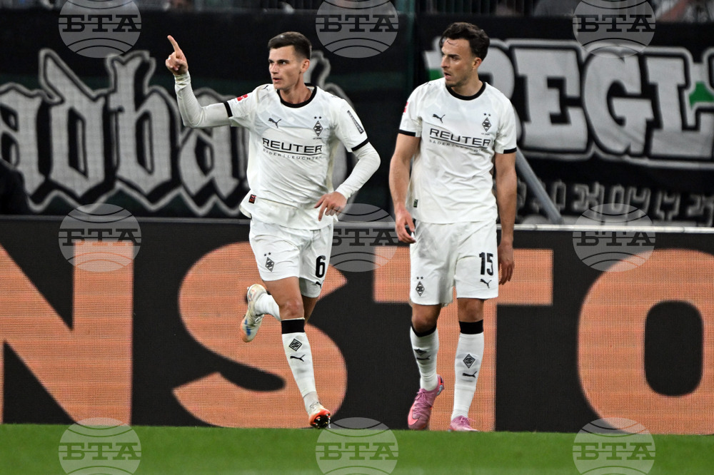 Mönchengladbach's Yannik Engelhardt, left, celebrates scoring during the Bundesliga soccer match between Borussia Mönchengladbach and Eintracht Frankfurt at Stadion im Borussia-Park, Mönchengladbach, Germany, Saturday Sept. 27, 2025. (Federico Gambarini/dpa via AP)