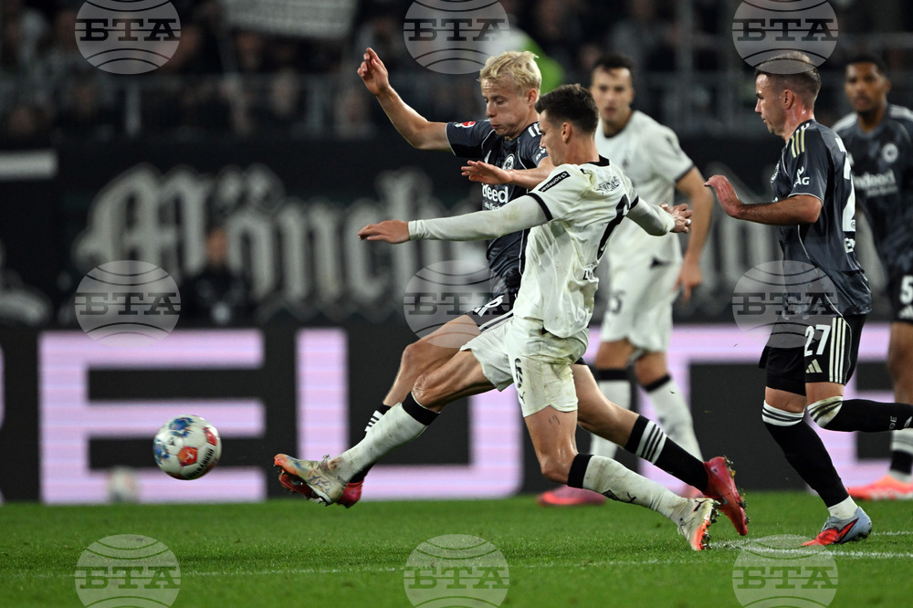 Mönchengladbach's Yannik Engelhardt and Frankfurt's Oscar Höjlund, left, in action during the Bundesliga soccer match between Borussia Mönchengladbach and Eintracht Frankfurt at Stadion im Borussia-Park, Mönchengladbach, Germany, Saturday Sept. 27, 2025. (Federico Gambarini/dpa via AP)