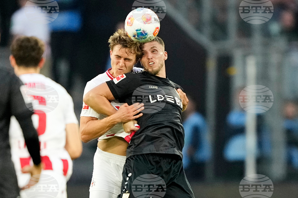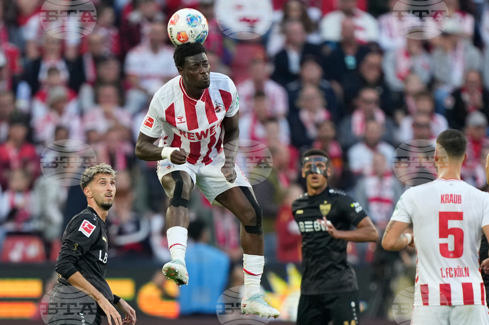 Cologne's Ragnar Ache jumps for a header during the German Bundesliga soccer match between 1.FC Köln and VfB Stuttgart in Cologne, Germany, Sunday, Sept. 28, 2025. (AP Photo/Martin Meissner)