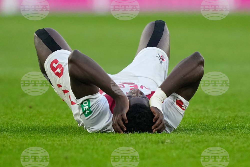 Injured Cologne's Ragnar Ache lays on the ground during the German Bundesliga soccer match between Cologne and VfB Stuttgart in Cologne, Germany, Sunday, Sept. 28, 2025. (AP Photo/Martin Meissner)