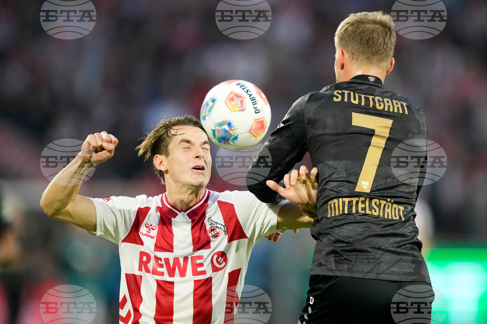 Cologne's Jakub Kaminski, left, vie for the ball with Stuttgart's Maximilian Mittelstaedt during the German Bundesliga soccer match between Cologne and Stuttgart in Cologne, Germany, Sunday, Sept. 28, 2025. (AP Photo/Martin Meissner)