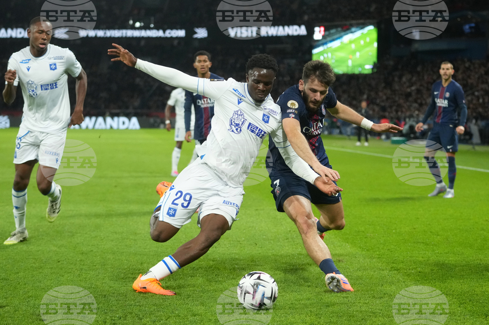 Auxerre's Lasso Coulibaly tries to block a shot from PSG's Ibrahim Mbaye, left, during the French League One soccer match between Paris Saint-Germain and Auxerre at the Parc des Princes in Paris, Saturday, Sept. 27, 2025. (AP Photo/Thibault Camus)