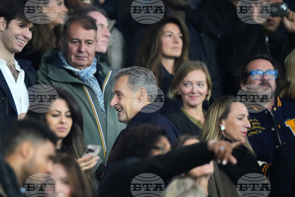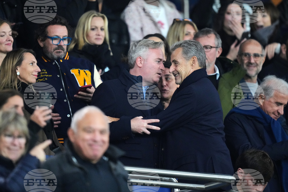 Former President of France Nicolas Sarkozy, right, on the stands during the French League One soccer match between Paris Saint-Germain and Auxerre at the Parc des Princes in Paris, Saturday, Sept. 27, 2025. (AP Photo/Thibault Camus)