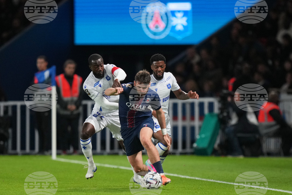 Auxerre's Kevin Danois fights for the ball with PSG's Lee Kang-in during the French League One soccer match between Paris Saint-Germain and Auxerre at the Parc des Princes in Paris, Saturday, Sept. 27, 2025. (AP Photo/Thibault Camus)