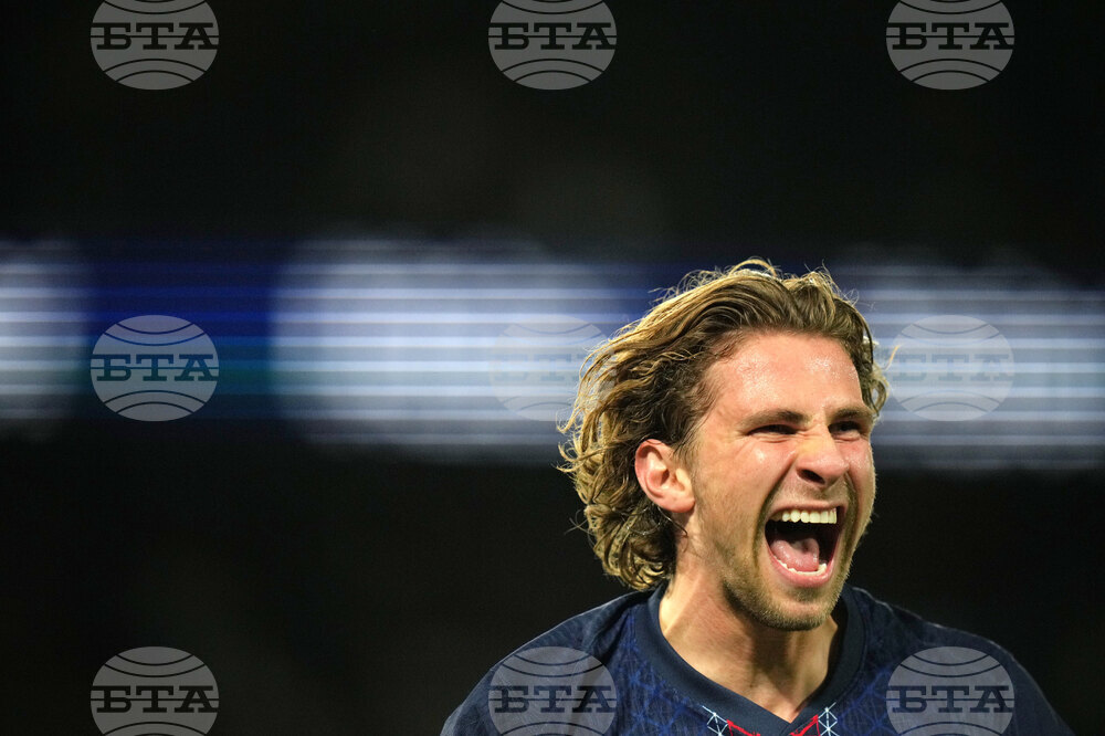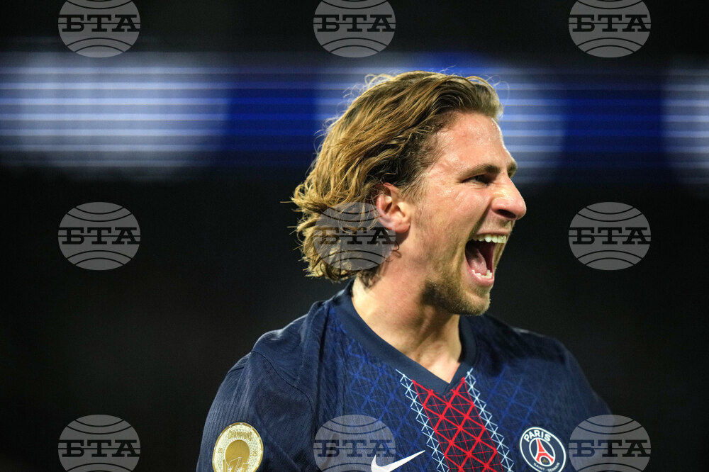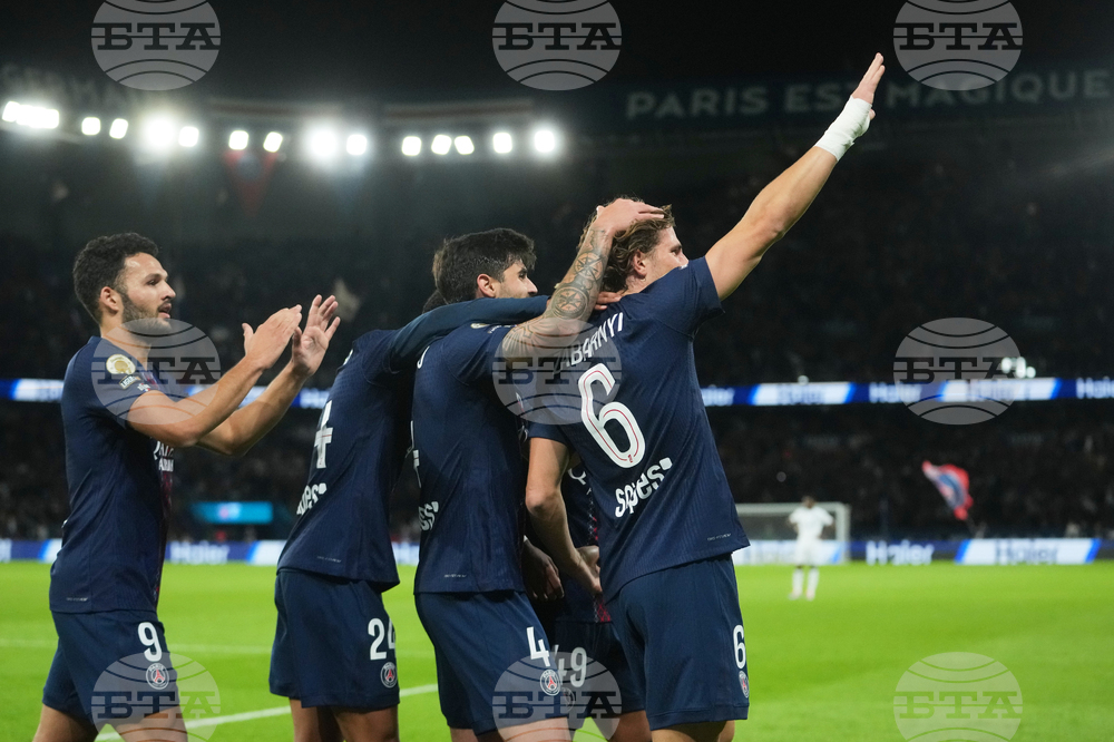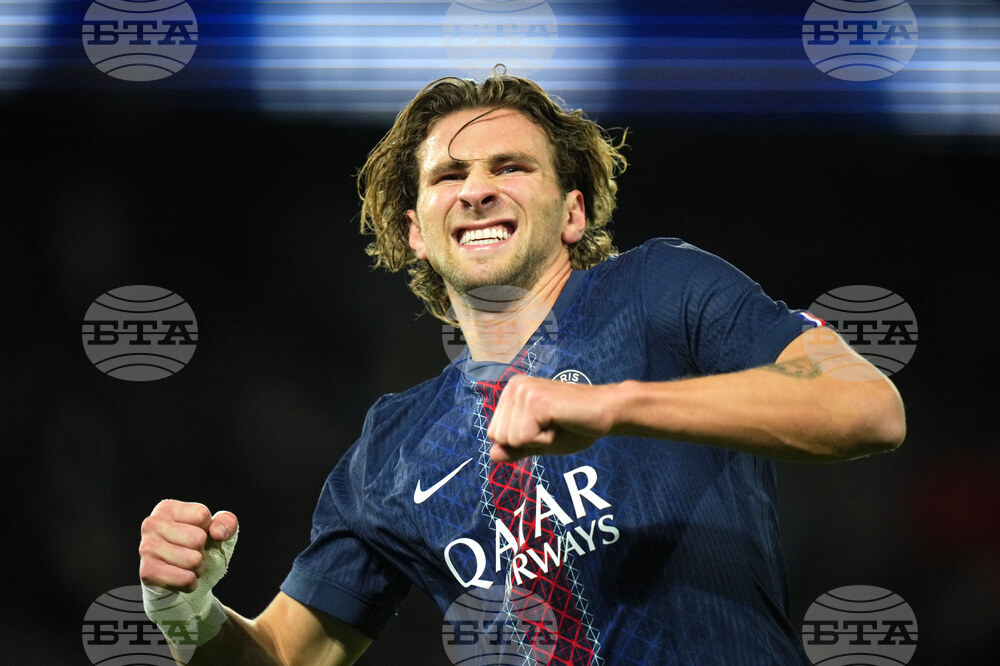 PSG's Illya Zabarnyi celebrates after scoring the opening goal during the French League One soccer match between Paris Saint-Germain and Auxerre at the Parc des Princes in Paris, Saturday, Sept. 27, 2025. (AP Photo/Thibault Camus)