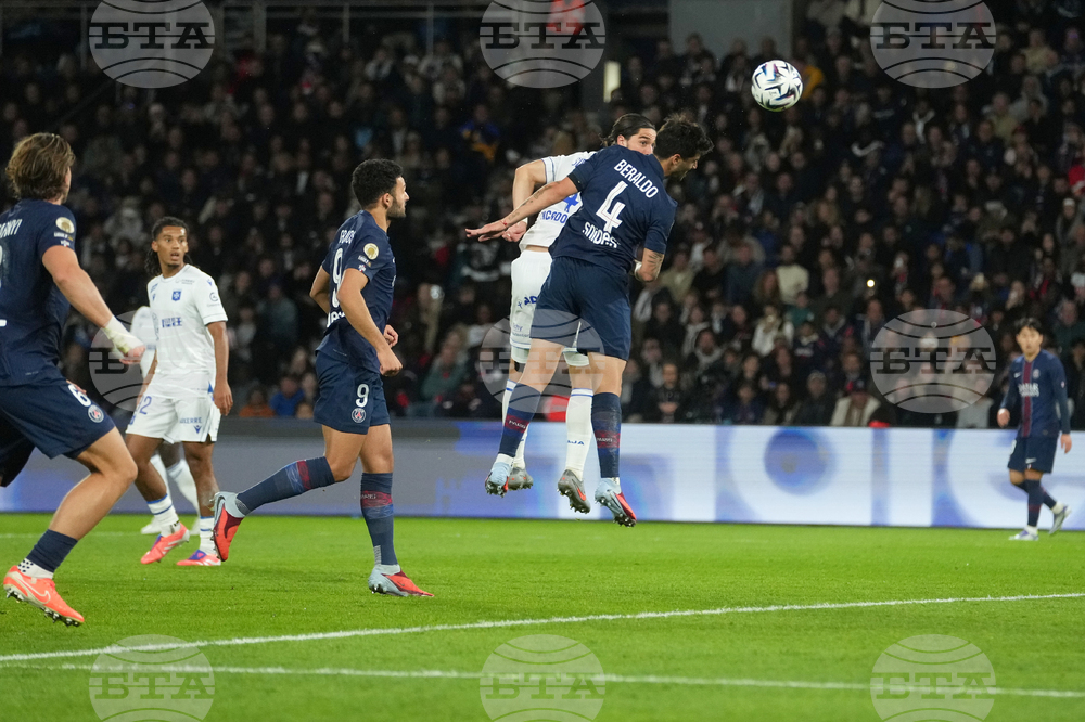 PSG's Lucas Beraldo, right, scores his side's second goal during the French League One soccer match between Paris Saint-Germain and Auxerre at the Parc des Princes in Paris, Saturday, Sept. 27, 2025. (AP Photo/Thibault Camus)