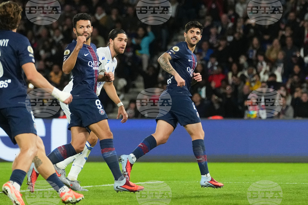 PSG's Illya Zabarnyi, right, celebrates after scoring the opening goal during the French League One soccer match between Paris Saint-Germain and Auxerre at the Parc des Princes in Paris, Saturday, Sept. 27, 2025. (AP Photo/Thibault Camus)