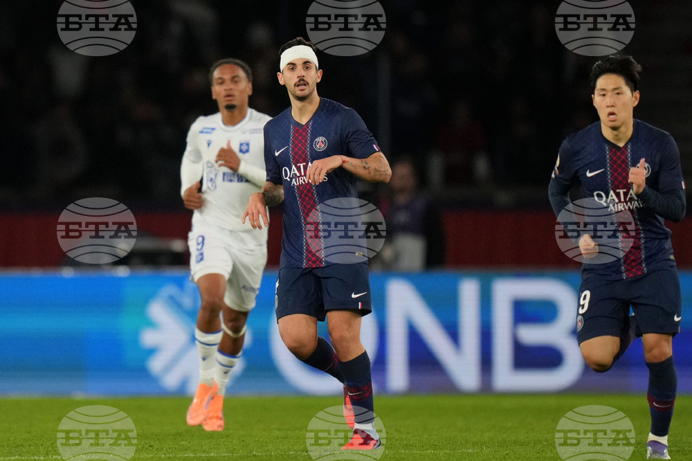 PSG's Bradley Barcola runs with the ball during the French League One soccer match between Paris Saint-Germain and Auxerre at the Parc des Princes in Paris, Saturday, Sept. 27, 2025. (AP Photo/Thibault Camus)