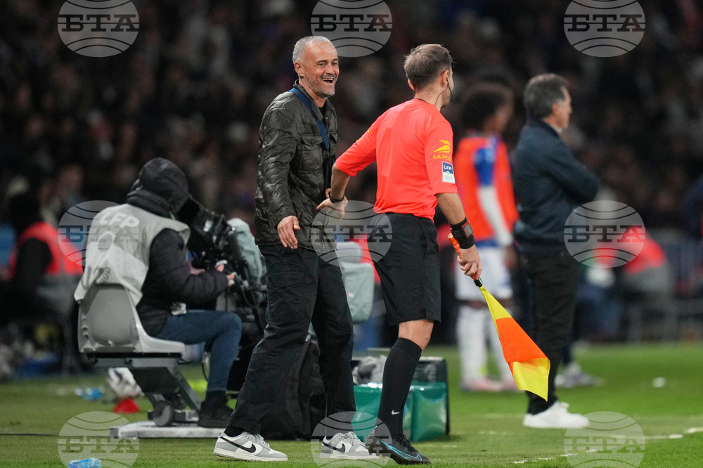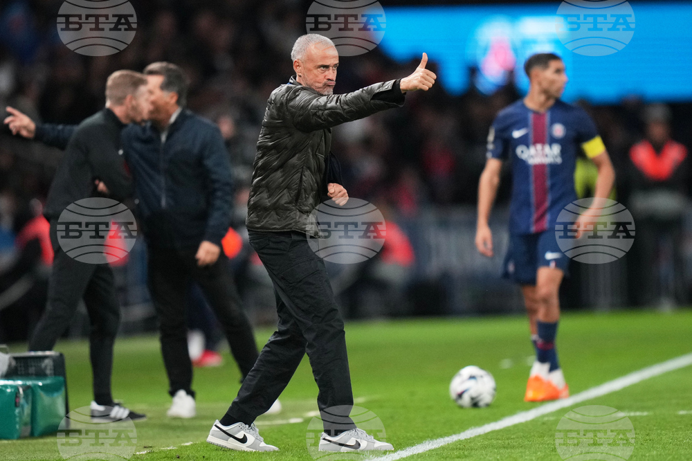 PSG's head coach Luis Enrique watches from the touchline during the French League One soccer match between Paris Saint-Germain and Auxerre at the Parc des Princes in Paris, Saturday, Sept. 27, 2025. (AP Photo/Thibault Camus)