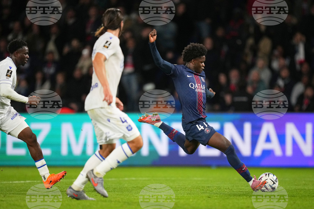 PSG's Ibrahim Mbaye, right, vies for the ball with Auxerre's Clement Akpa during the French League One soccer match between Paris Saint-Germain and Auxerre at the Parc des Princes in Paris, Saturday, Sept. 27, 2025. (AP Photo/Thibault Camus)