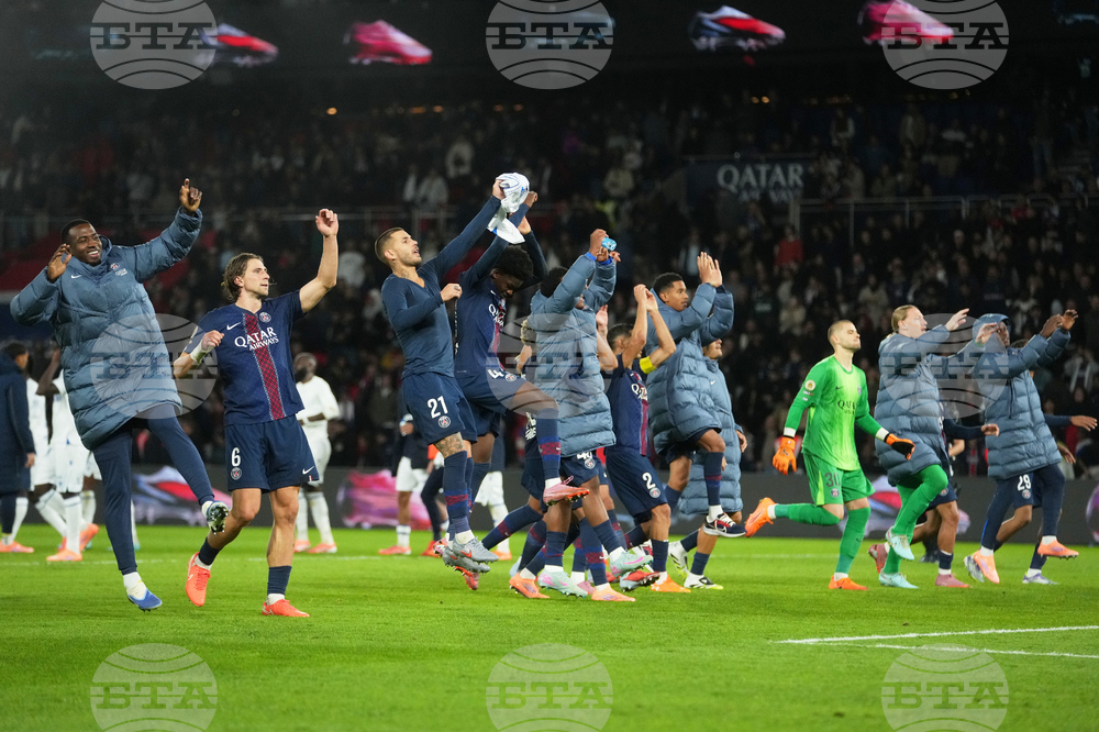 PSG players celebrate at the end of the French League One soccer match between Paris Saint-Germain and Auxerre at the Parc des Princes in Paris, Saturday, Sept. 27, 2025. (AP Photo/Thibault Camus)