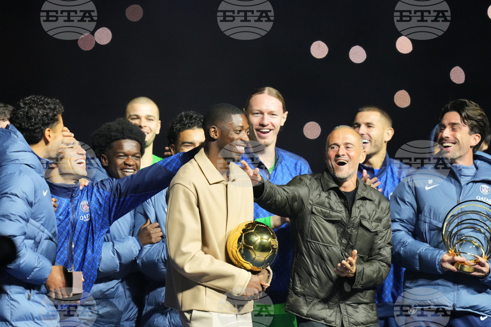 PSG's head coach Luis Enrique holds the 2025 Johann Cruyff trophy for the best coach of the year, Ousmane Dembele the Men's Ballon d'Or, or Golden Ball, for the best player of the year and team captain Marquinhos, right, the Club of the Year award that were awarded earlier in the week, after the French League One soccer match between Paris Saint-Germain and Auxerre at the Parc des Princes in Paris, Saturday, Sept. 27, 2025. (AP Photo/Thibault Camus)