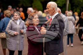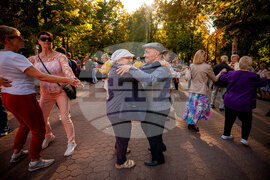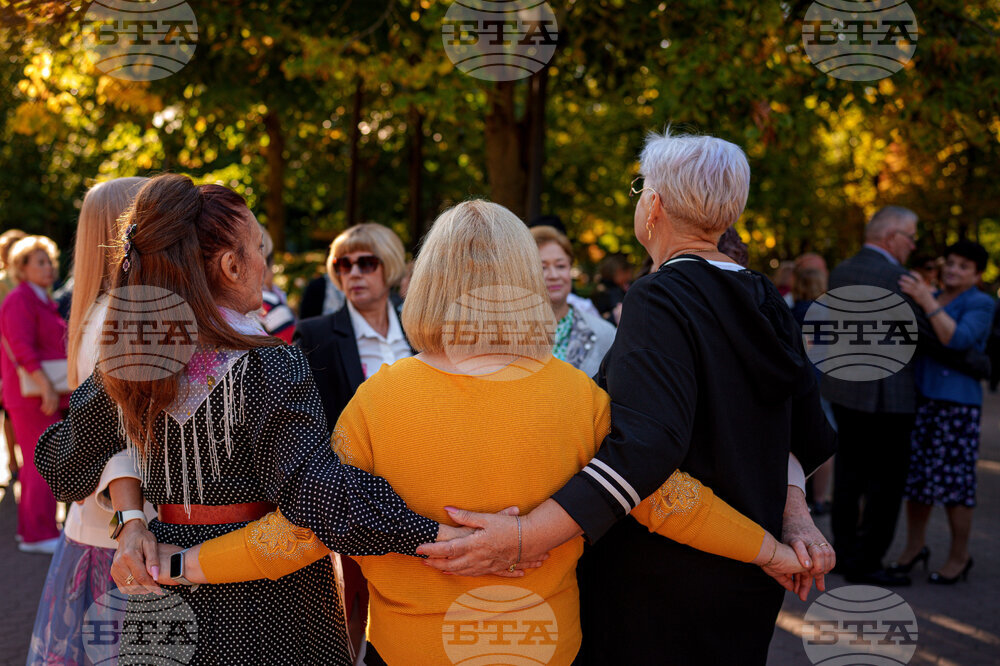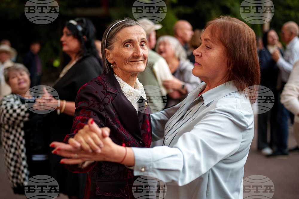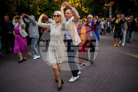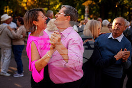 People dance during a weekly dance event organized by the city hall to support the social inclusion of the elderly in the Stefan Cel Mare public garden, in Chisinau, Moldova, Friday, Sept. 26, 2025. (AP Photo/Vadim Ghirda)