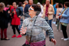 A woman dances during a weekly dance event organized by City Hall to support the social inclusion of the elderly in the Stefan Cel Mare public garden, in Chisinau, Moldova, Friday, Sept. 26, 2025. (AP Photo/Vadim Ghirda)