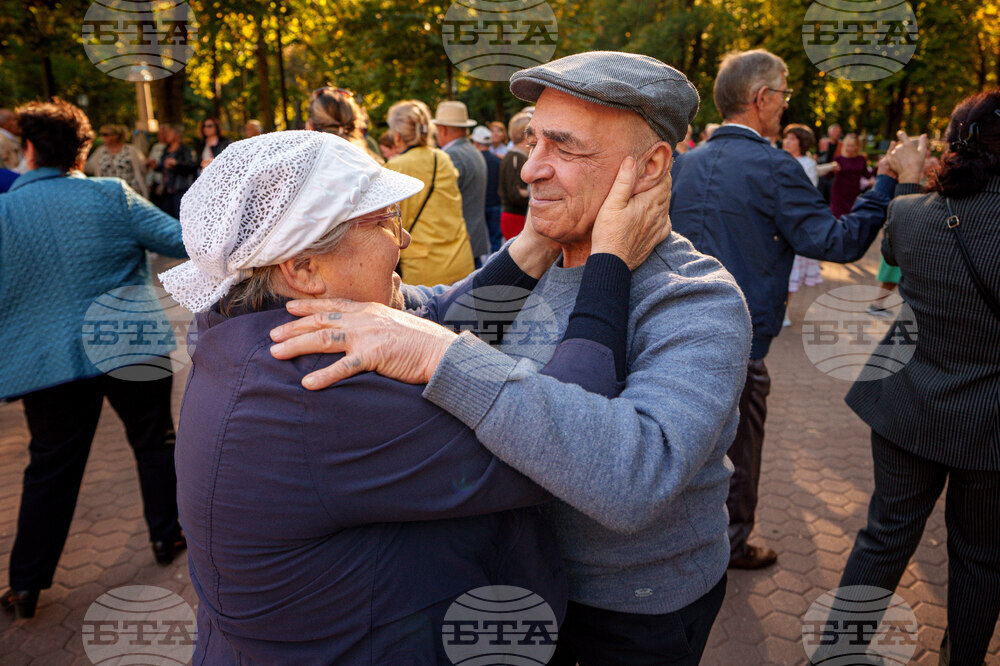 People dance during a weekly dance event organized by the city hall to support the social inclusion of the elderly in the Stefan Cel Mare public garden, in Chisinau, Moldova, Saturday, Sept. 27, 2025. (AP Photo/Vadim Ghirda)