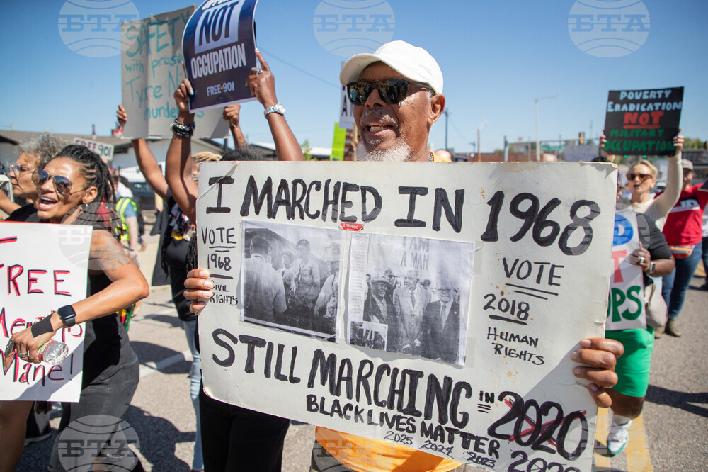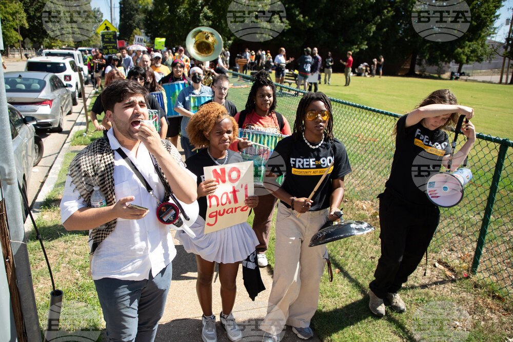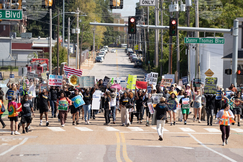 Protestors gather for a march in Memphis, Tenn., Saturday, Sept. 27, 2025, to protest against the deployment of National Guard troops to Memphis. (AP Photo/Nikki Boertman)